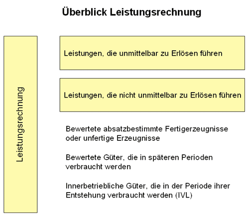 Einen Überblick über die verschiedenen Leistungsrechnungen zeigt folgendes Bild. In unserem Kurs sollen uns nur Leistungen interessieren, welche zur Internen Leistungsverrechnung genutzt werden. Diese Leistungen führen nicht unmittelbar zu Erlösen.