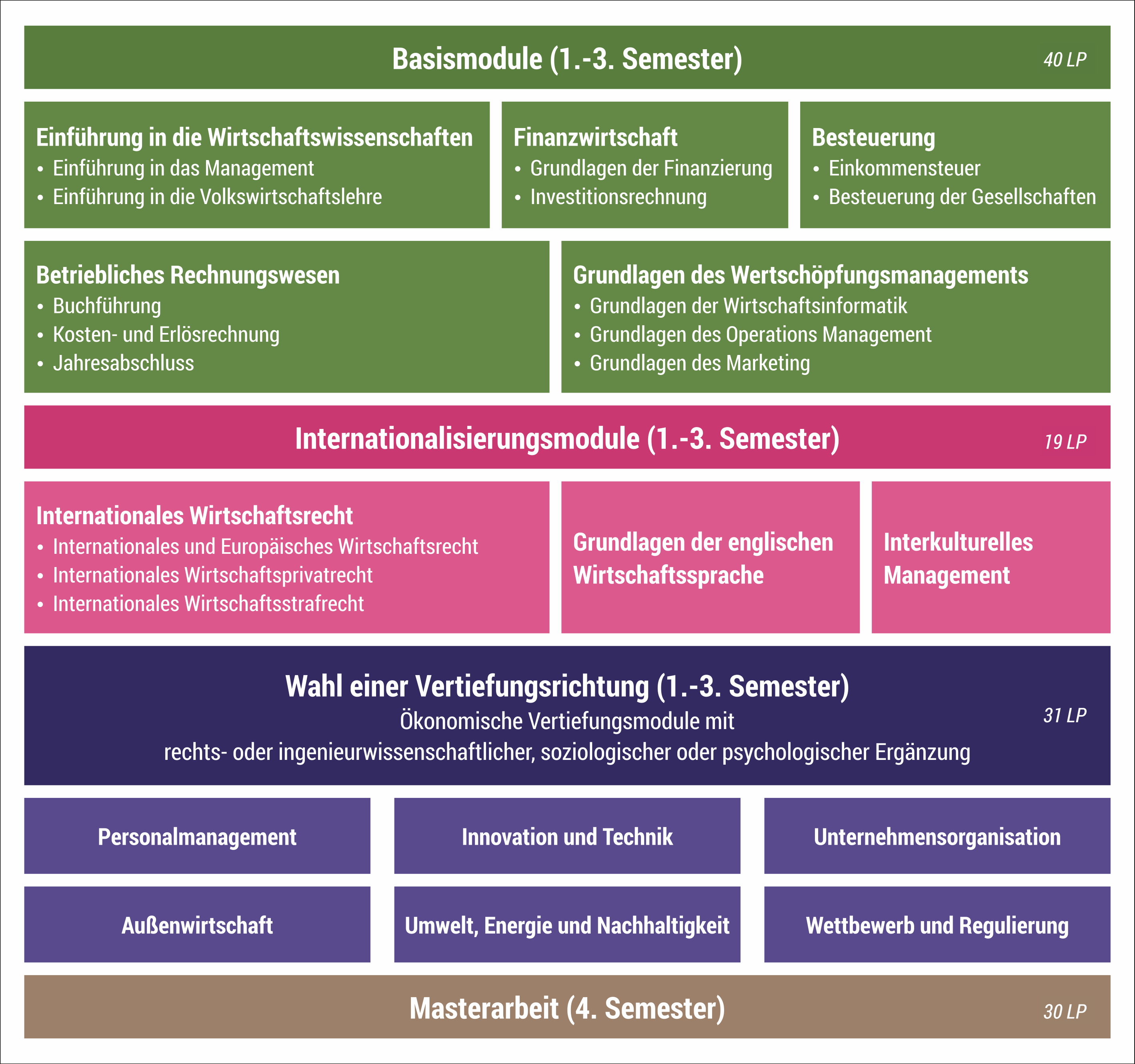 Der Masterstudiengang "Wirtschaftswissenschaften für Juristen" ergänzt die breit angelegte juristische Ausbildung durch grundlegende betriebs- und volkswirtschaftliche Kenntnisse und vertieft die gewonnene Schnittstellenkompetenz durch eine Verzahnung von ökonomischen und rechtswissenschaftlichen Schwerpunkten - ergänzt um soziologische, psychologische und internationale Aspekte.