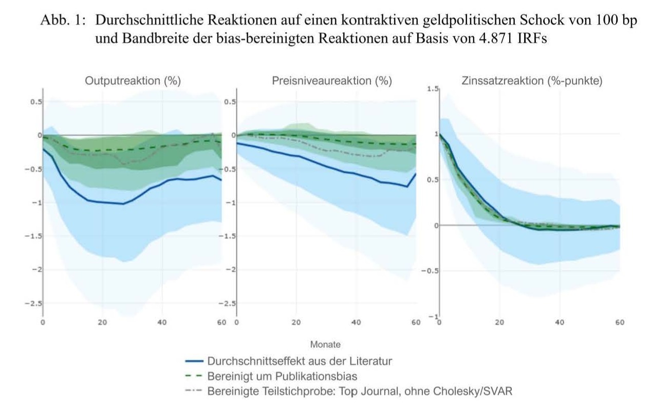 In unserer umfassenden Forschungssynthese untersuchen wir insbesondere, inwiefern p-Hacking, Publikationsbias sowie unterschiedliche Identifikationsmethoden und andere Studienmerkmale der heterogenen Literatur die Ergebnisse beeinflussen. Mittels moderner meta-analytischer Methoden ermitteln wir dabei bereinigte makroökonomische Durchschnittseffekte konventioneller Geldpolitik.