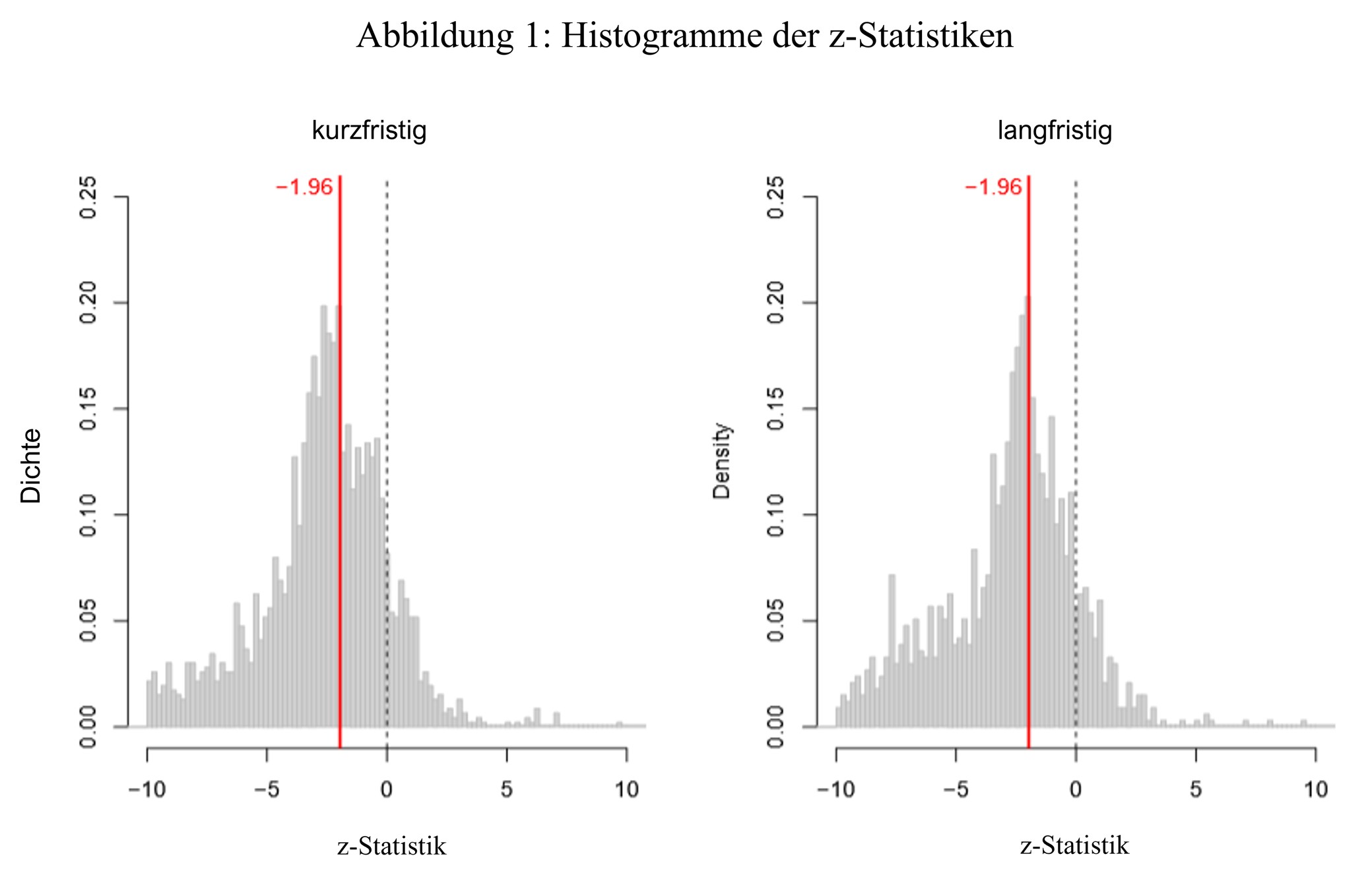 Interpretation: Die Histogramme zeigen zwei auffällige Diskontinuitäten auf: Zum einen häufen sich die Schätzwerte knapp links von z = 0, was darauf hindeutet, dass Ergebnisse mit negativen Elastizitäten bevorzugt berichtet werden. Zum anderen treten vermehrt Werte knapp links der üblichen 5%-Signifikanzschwelle für negative Effekte (z < −1,96) auf, was auf p-Hacking schließen lässt. Dieses zweistufige Muster ist im kurzfristigen Histogramm stärker ausgeprägt, aber auch im langfristigen erkennbar.