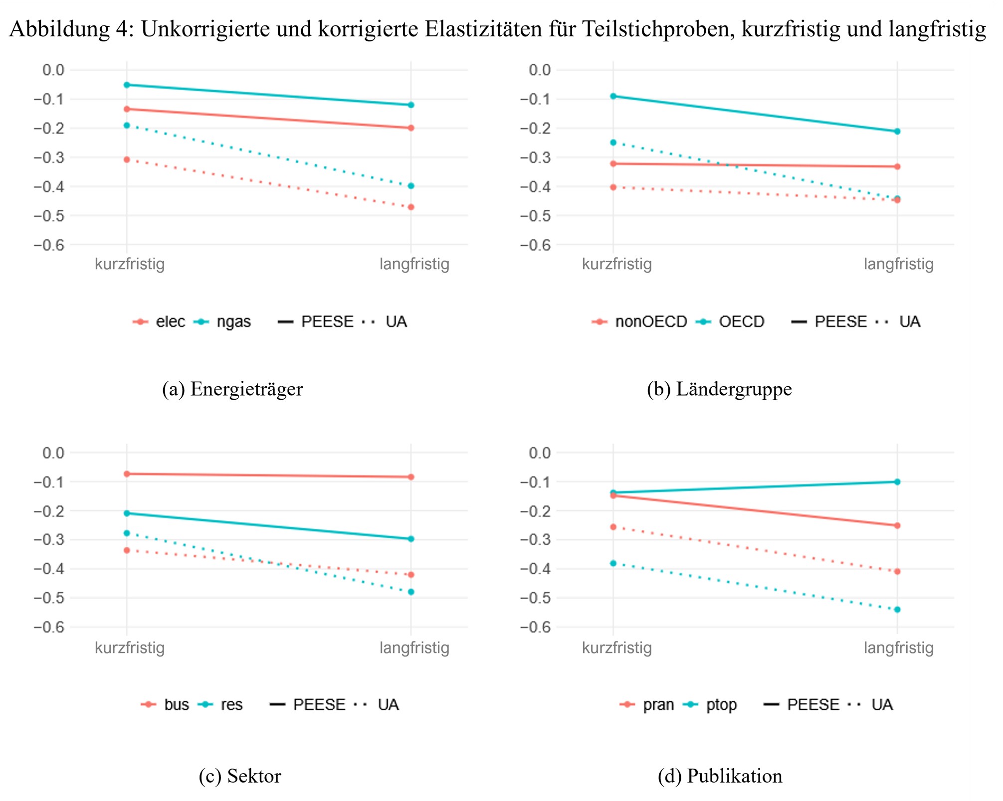 Beschreibung: Die Abbildungen zeigen die ungegewichteten Durchschnittswerte (UA, gestrichelte Linien) und die um Publikationsbias korrigierten Effektgrößen (PEESE-Methode, durchgezogene Linien) der kurzfristigen und langfristigen Elastizitäten für zentrale Teilstrichproben: Energieträger (Elektrizität und Erdgas), Ländergruppe (Nicht-OECD und OECD), Sektor (Unternehmen und Haushalte) sowie Publikationstyp (Top-Journale vs. andere). Quelle: https://osf.io/preprints/osf/4sjy5, Figure 4.