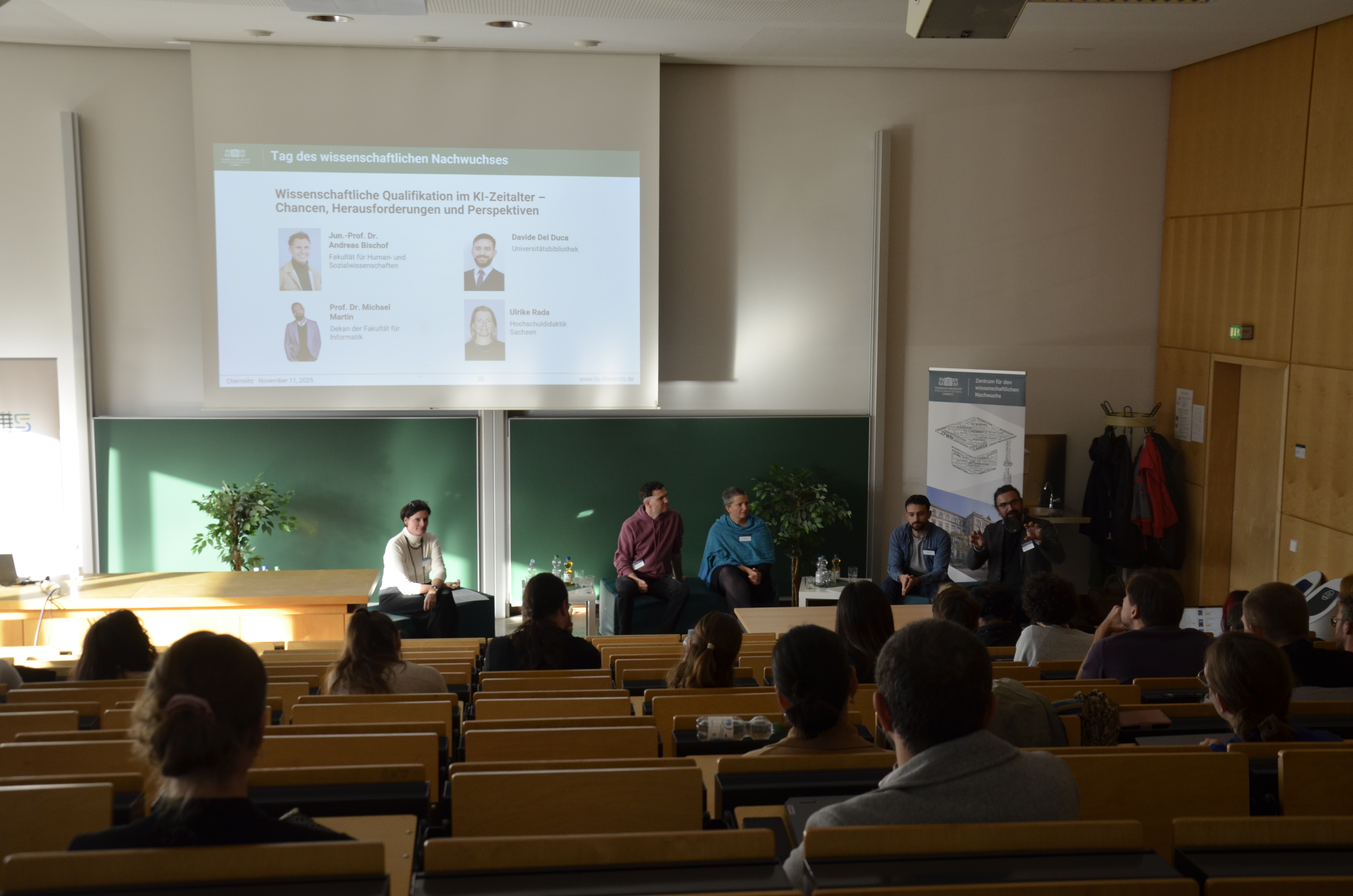 Wie sich wissenschaftliche Qualifikation durch Digitalisierung und KI verändern, stand am Nachmittag im Fokus. Die Session „Wissenschaftliche Qualifikation im KI-Zeitalter – Chancen, Herausforderungen und Perspektiven“, moderiert von Prof. Dr. Anja Strobel, brachte unterschiedliche Expertisen zusammen. Jun.-Prof. Dr. Andreas Bischof (Fakultät für Human- und Sozialwissenschaften), Davide Del Duca (Universitätsbibliothek), Prof. Dr. Michael Martin (Dekan der Fakultät für Informatik) und Ulrike Rada (Hochschuldidaktik Sachsen) diskutierten, wie KI-basierte Werkzeuge Arbeitsprozesse in Forschung und Lehre verändern – und welche Kompetenzen Nachwuchswissenschaftlerinnen und Nachwuchswissenschaftler künftig verstärkt benötigen. Die Beiträge machten deutlich: KI eröffnet neue Möglichkeiten zur Unterstützung wissenschaftlicher Arbeit, verlangt aber zugleich hohe Reflexionsfähigkeit, Transparenz und eventuell neue Formen der Bewertung wissenschaftlicher Leistungen und von Qualifikationsprozessen.
