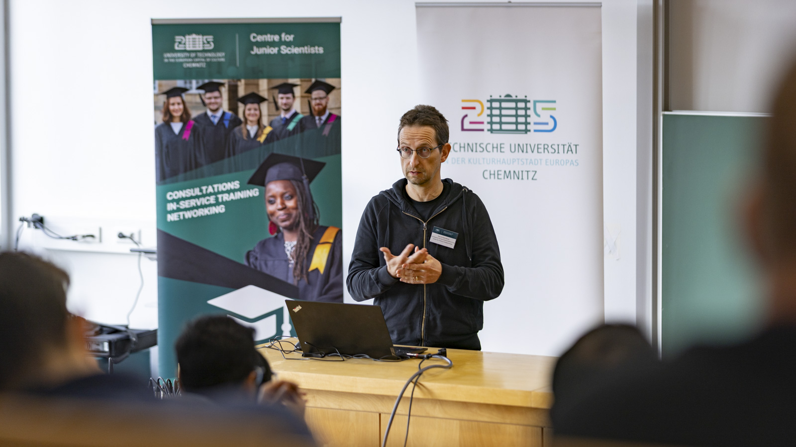 Prof. Dr. Jörn Ihlemann eröffnete um 14:00 Uhr die Veranstaltung und begrüßte die Gäste im vollen Hörsaal N113 auf dem Campus Reichenhainer Straße. Er stellte sich außerdem als neuer Direktor des Zentrums für den wissenschaftlichen Nachwuchs vor und dankte an dieser Stelle seinem Vorgänger, Prof. Dr. Heinrich Lang, der wesentliche Teile des Programmablaufs vorbereitet hatte. Dann führte er das Publikum in die Themen des Tages und das Programm ein.
