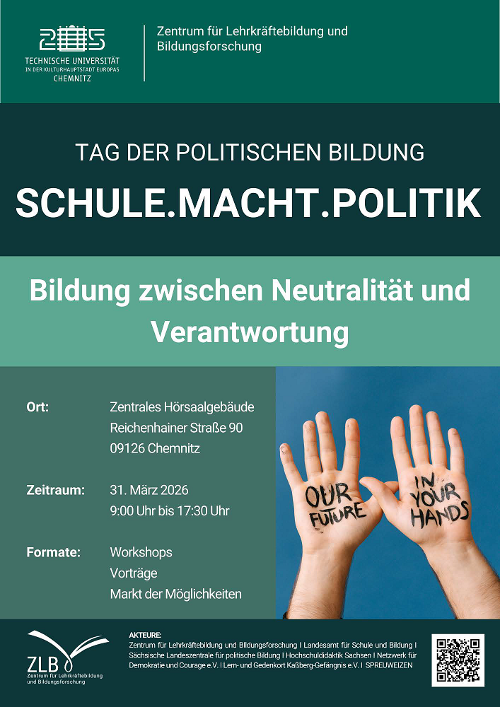 Wir freuen uns, Sie am Dienstag, 31.03.2026, von 9 - 17:30 Uhr zum Aktionstag "Politische Bildung 2.0" an der TU Chemnitz einladen zu dürfen. Der Aktionstag findet statt im Zentralen Seminar- und Hörsaalgebäude in der Reichenhainer Straße 90 in Chemnitz. Weitere Informationen erhalten Sie unter: https://www.tu-chemnitz.de/zlb/pobi/ |