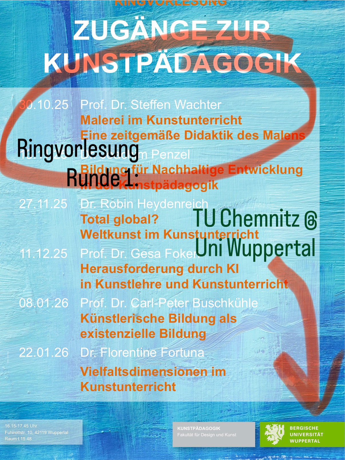 Auf Einladung der Bergischen Universität Wuppertal und Prof. Dr. Jochen Krautz (Lehrstuhl für Kunstpädagogik) wurde die Ringvorlesung "Zugänge zur Kunstpädagogik" mit dem Thema "Malerei im Kunstunterricht. Eine zeitgemäße Didaktik des Malens" von Prof. Dr. Steffen Wachter (Lehrstuhl Kunstdidaktik am ZLB der TU Chemnitz) eröffnet. Die Veranstaltung wurde von zahlreichen Lehrerinnen und Lehrern und des BDK - Fachverband Kunstpädagogik, Landesverband NRW als Weiterbildungsangebot genutzt. Die Expertise der Kunstdidaktik in Chemnitz im Bereich des Didaktik des Malens wurde von den Hörern sehr geschätzt und durch eine sehr interessierte und spannende Diskussion begleitet. Eine Pop-Up-Ausstellung mit Ergebnissen aus dem Unterricht von Prof. Wachter am BIP Kreativitätsschulzentrum Leipzig visualisierte das didaktische Modell zusätzlich.