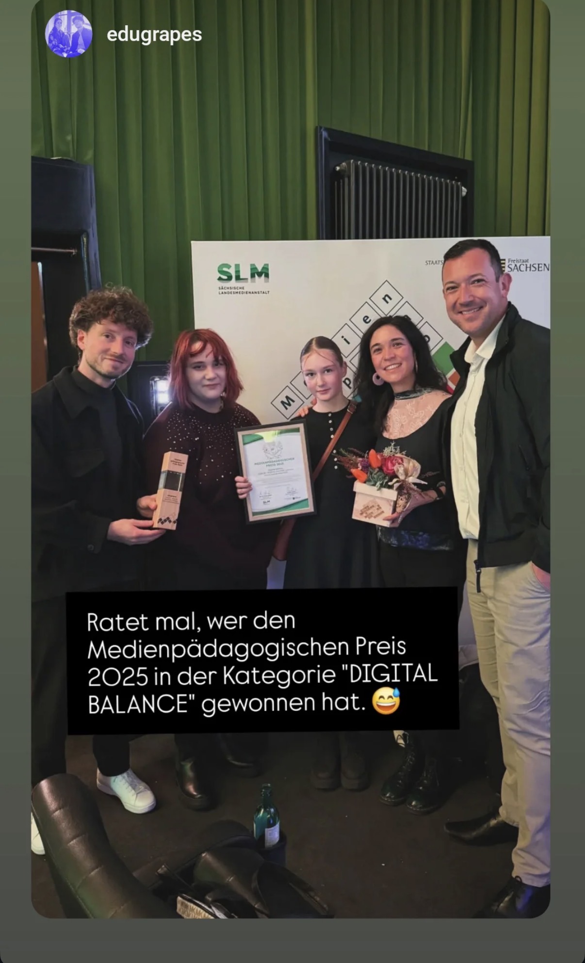 Seit Oktober 2025 hat der Lehrstuhl Fachdidaktik Kunst eine neue Wissenschaftliche Mitarbeiterin: Natalia Peña Ascarrunz. Sie wird sich am ZLB in den kommenden Jahren wissenschaftlich weiterqualifizierten und promovieren. Ihre Expertise wird sie darüber hinaus natürlich auch in Lehre und Forschung mit einbringen. Dass Sie bereits viel Erfahrung und Fachwissen mitbringt, beweist die Verleihung des "Medienpädagogischen Preises 2025" in der Kategorie "Digitale Balance" an sie und ihren Teampartner bei "edugrapes", Christopher Utpadel. Ausgezeichnet wurde das Projekt "LED.IT - digitale Identität zwischen Schutz und Sichtbarkeit", was 2024 gemeinsam mit dem "Helmholtz-Club" der Helmholtz-Oberschule Leipzig in Zusammenarbeit mit dem Kunstpädagogen Michael Lieberodt durchgeführt wurde. Überreicht wurde der Preis vom Sächsischen Staatsministerium für Kultus (SMK) und die Sächsische Landesmedienanstalt (SLM) in der Schauburg in Dresden. Wir gratulieren herzlich und freuen uns auf die Zusammenarbeit am Lehrstuhl Fachdidaktik Kunst!