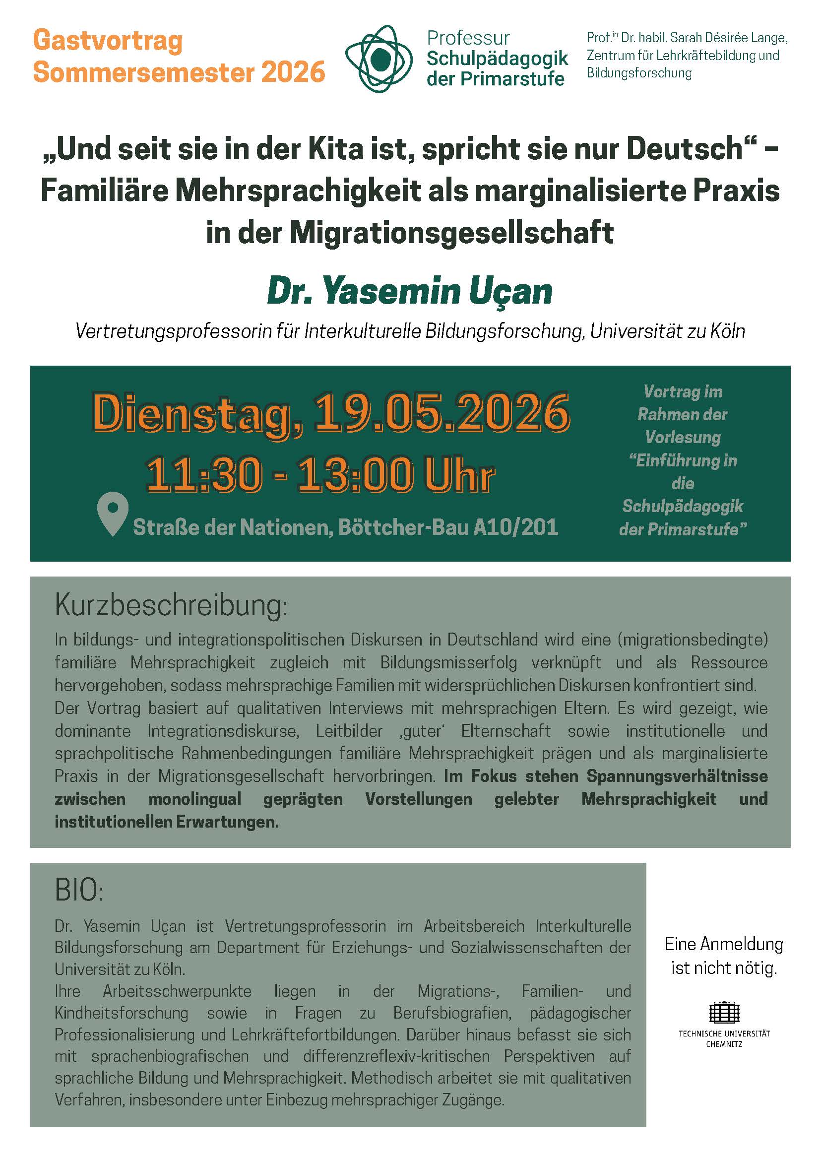 Am 19. Mai 2026 referiert Dr. Yasemin Uçan (Universität zu Köln) unter dem Titel „‚Und seit sie in der Kita ist, spricht sie nur Deutsch‘ – Familiäre Mehrsprachigkeit als marginalisierte Praxis in der Migrationsgesellschaft“. Der Vortrag beleuchtet auf Basis einer qualitativen Studie die Spannungsverhältnisse, denen mehrsprachige Familien im Kontext institutioneller Erwartungen begegnen.