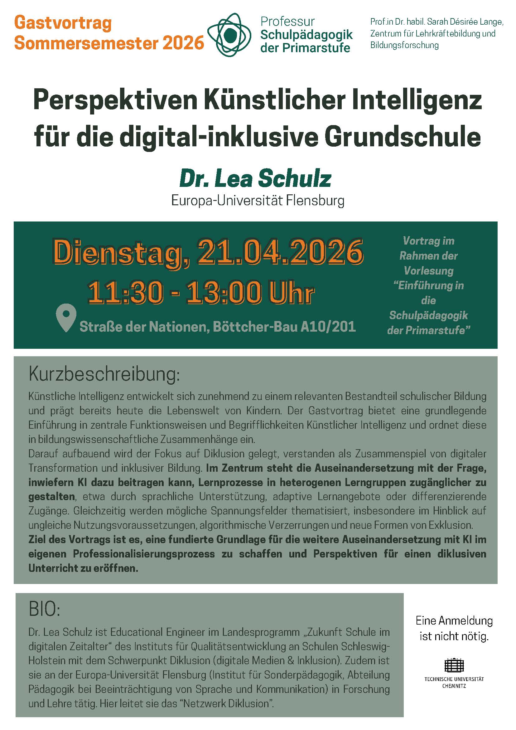 Im Sommersemester 2026 finden an der Professur für Schulpädagogik der Primarstufe erneut Gastvorträge im Rahmen der Vorlesung „Einführung in die Schulpädagogik der Primarstufe“ statt. Die Vorträge eröffnen Einblicke in aktuelle bildungswissenschaftliche Diskurse und verbinden theoretische Perspektiven mit empirischen Befunden. Dazu möchten wir sie herzlich einladen: