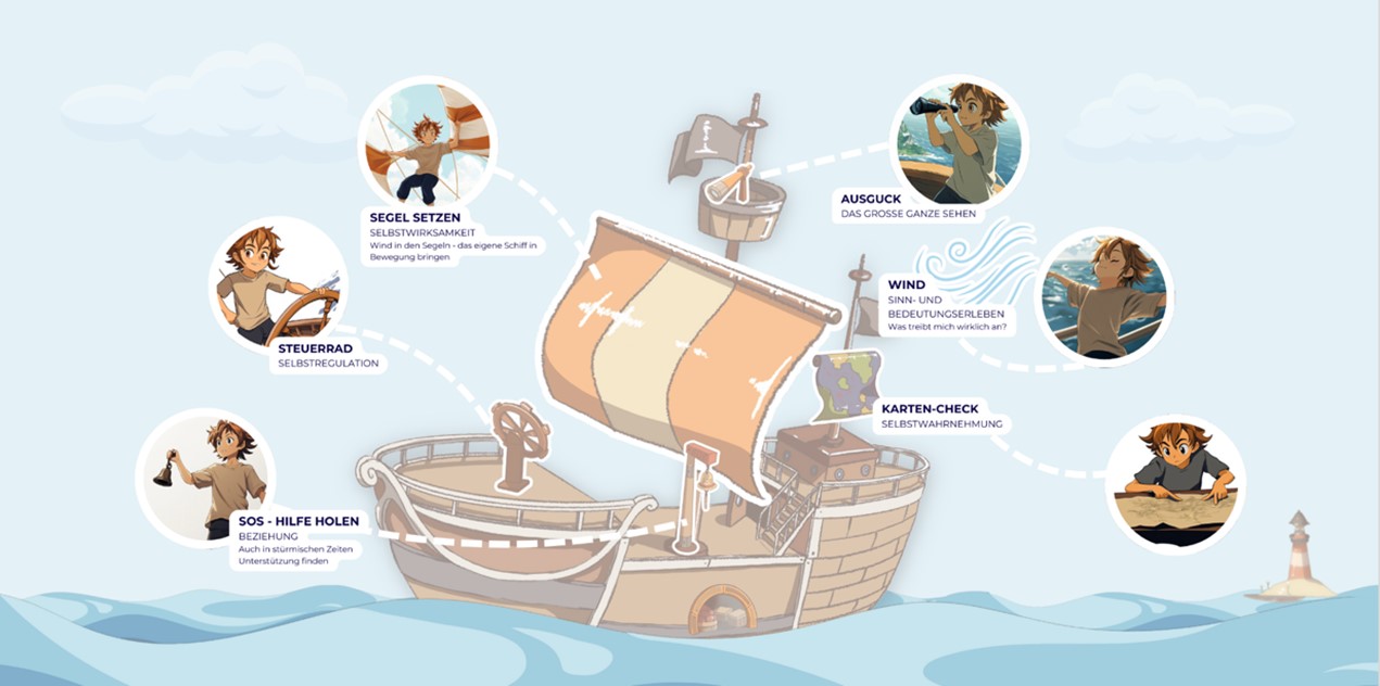 Zeichnung eines Schiffes und Besatzung mit Funktionen wie SOS Rufen, Segel Setzen und so weiter